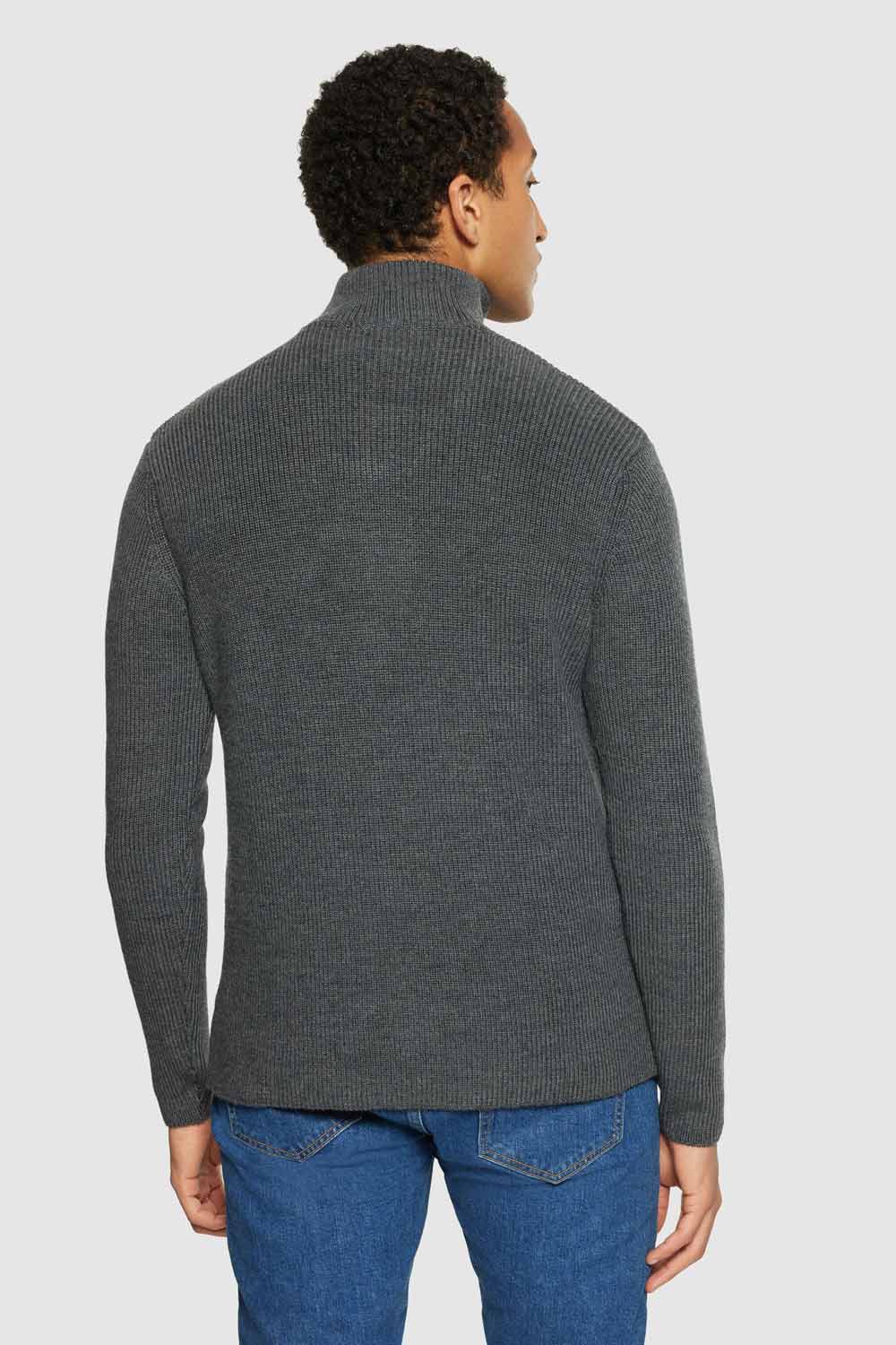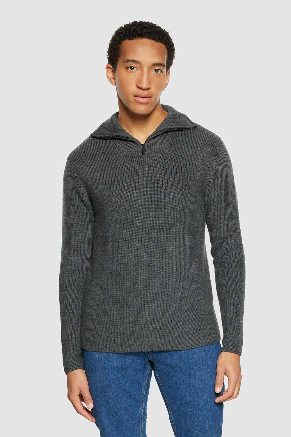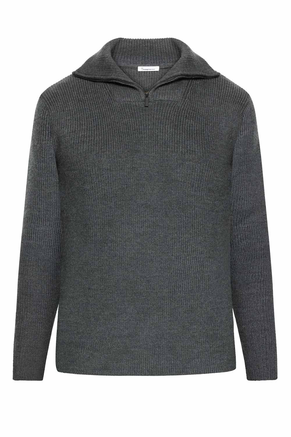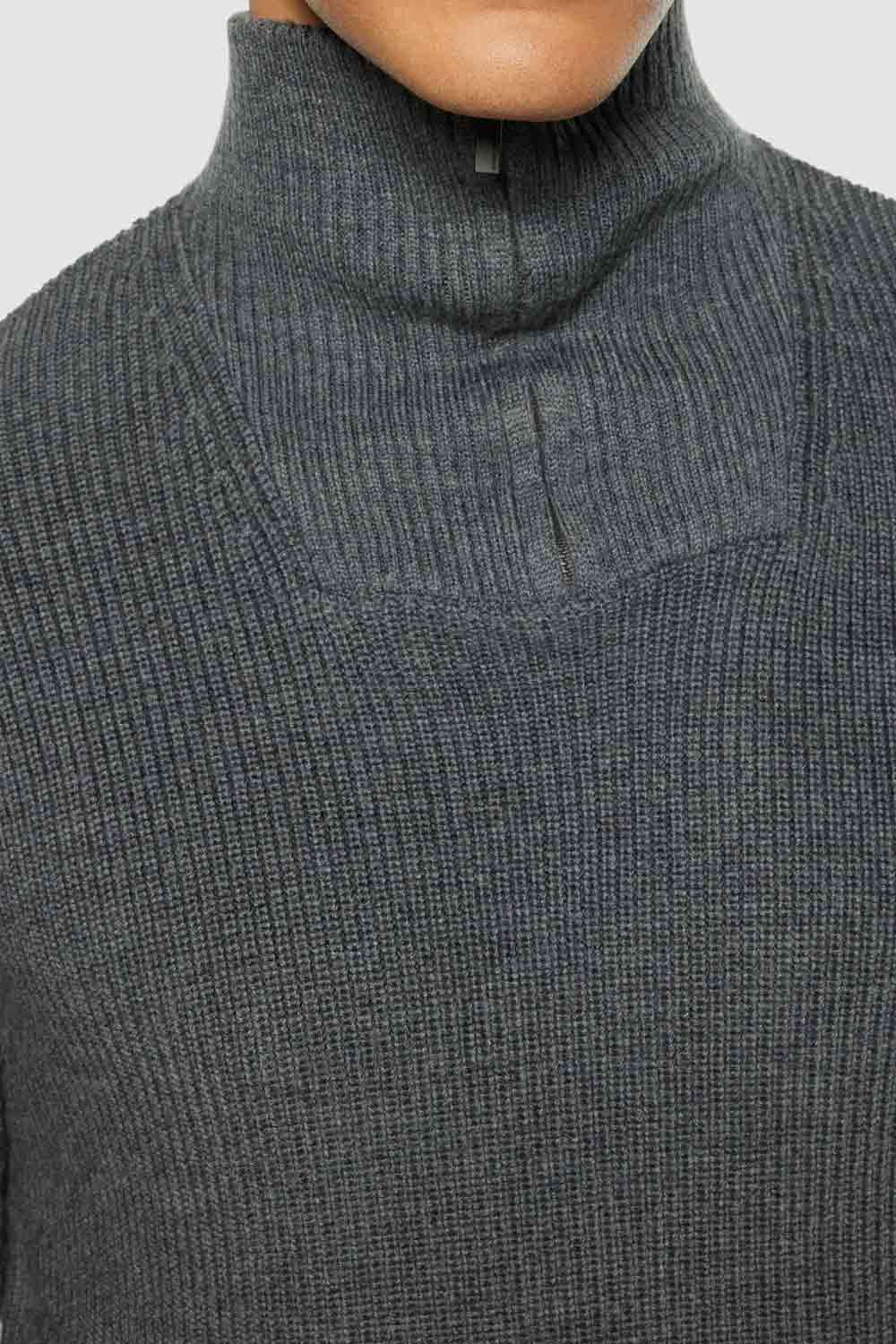 Stoere en wat zwaardere schipperstrui van 100% wol met het Responsible Wool Standard-keurmerk. De donkergrijze trui met col is gebreid met een kleine ribbel wat de trui de nodige rek geeft en in model houdt. De trui heeft geen boorden.