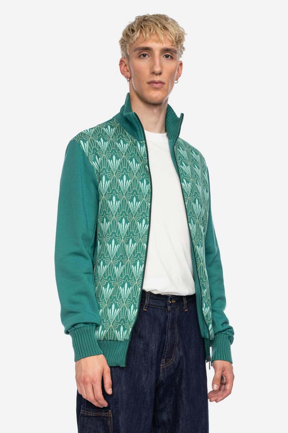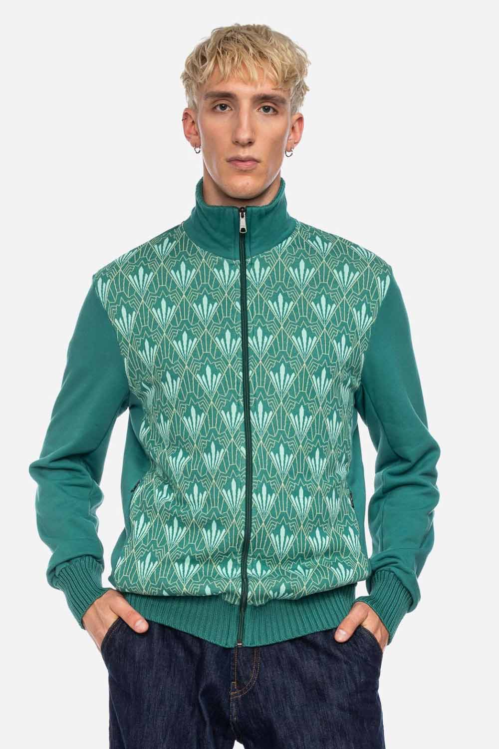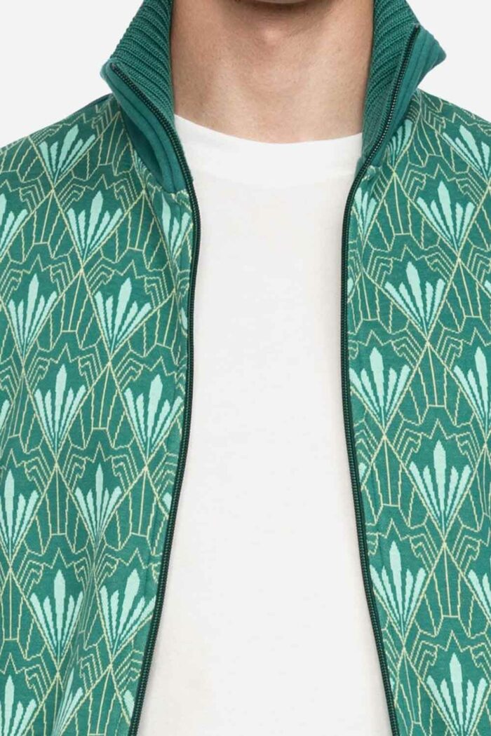 Ruimvallend sweatervest met opstaande kraag van 100% biologische katoen met een vintage print op het voorpand. Het voorpand is van stevige jacquard stof, de rest van een lekker dikke jersey. Dit jackje heeft een rits en twee zijzakken met rits en een binnenzak.