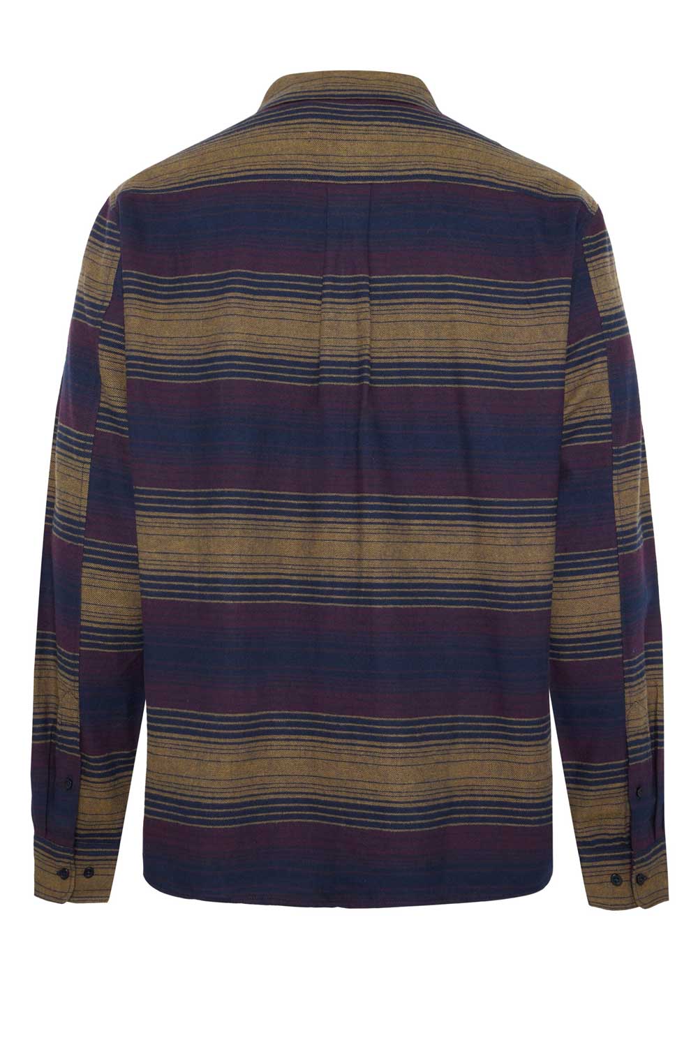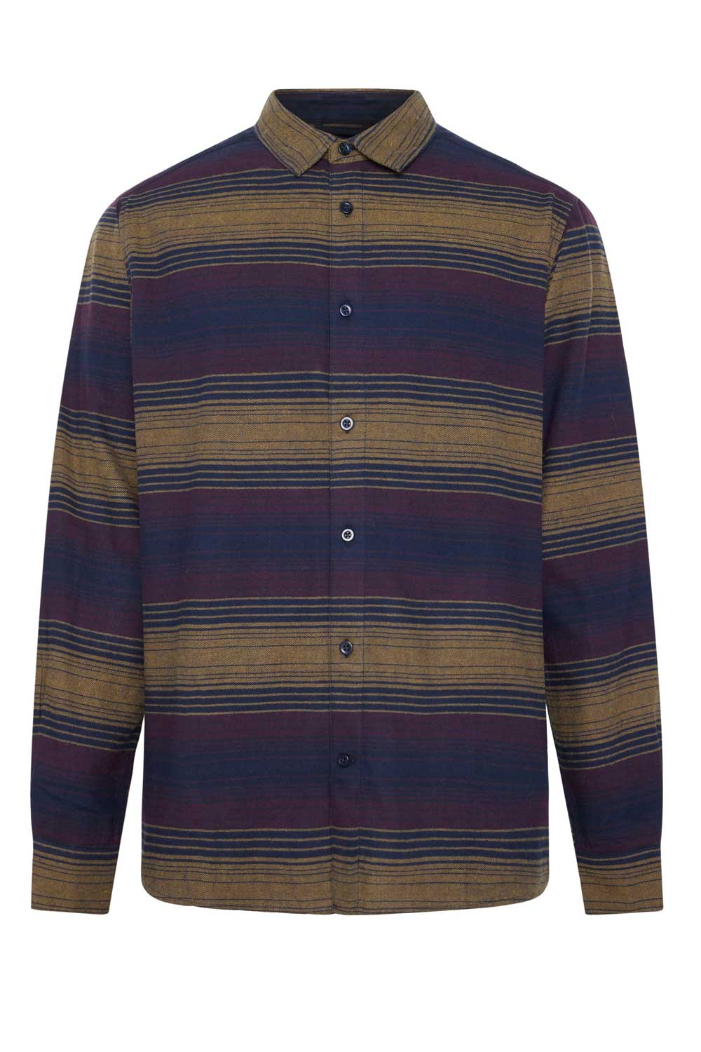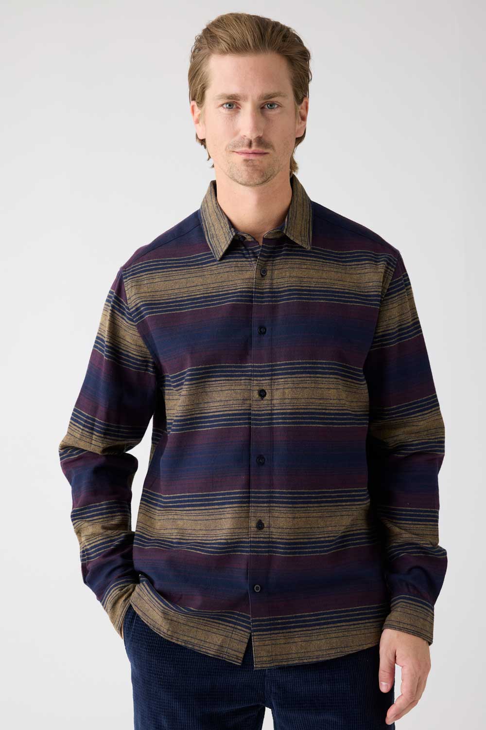 Winters overhemd van 100% biologisch katoenen flanel. Donkerblauw, bordeaux en beige/oker gestreept.