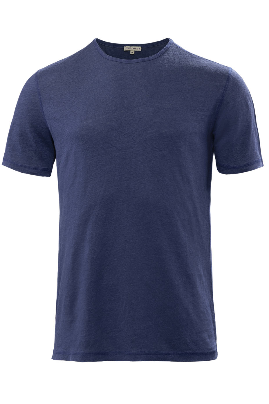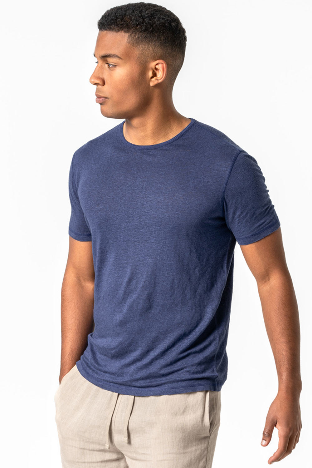 Blauw T-shirt van 100% linnen. Maat indicatie M: borstomtrek = 104 cm, lengte = 72 cm.