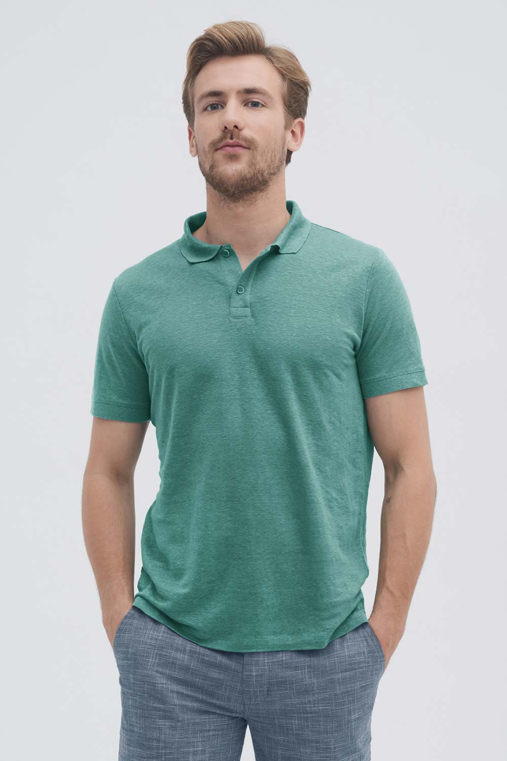 Polo-shirt van 100% linnen. Draagt heerlijk koel op een zomerse dag en staat toch gekleed. Valt groot!