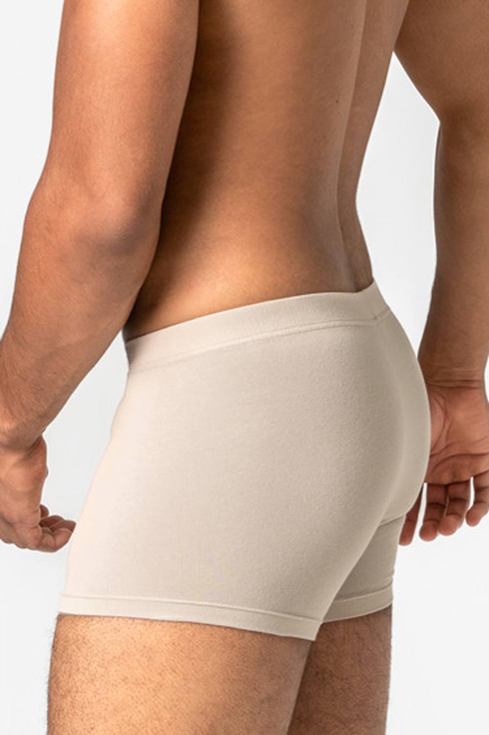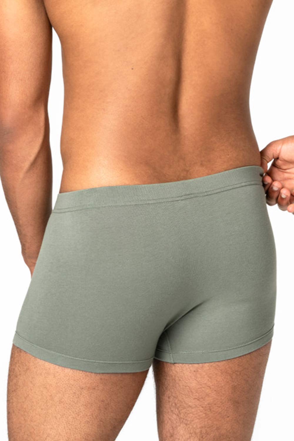 Aangesloten, superzachte boxershorts van 95% biologisch katoen en 5% elastaan. Verpakt per drie: in mosgroen, donkergroen en zandkleur. Er zit geen gulp in.